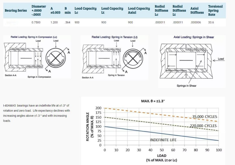 特殊要求:物質(zhì)的 :因科內(nèi)爾718高磷鎳黃銅Tsr :高扭轉(zhuǎn)彈簧速率I-40-MA5標(biāo)準(zhǔn)材料屬性部件材料: 因科內(nèi)爾718黃銅合金: 高磷鎳板春季材料特性:疲勞強度: 77,000 psi產(chǎn)量強度: 160,000 psi極限抗拉強度: 196,000 psi彈性模塊: 29,000,000 psi注:軸承的堅硬度按每磅載荷的偏轉(zhuǎn)英寸來定.這一數(shù)據(jù)適用于標(biāo)準(zhǔn)懸臂軸承在無支架的一半的中間點上,在0度旋轉(zhuǎn)。扭轉(zhuǎn)彈簧速率:(在*Lb/度)標(biāo)準(zhǔn)C-自由軸承的速率一般在零載荷時在這些數(shù)值的+/-10%之內(nèi)。負載能力:lt或lc(在張力或壓縮中的重磅負載),這些值為零偏轉(zhuǎn)時的**負載(重量或靜態(tài)力)。在給軸承上漿時,必須考慮載荷要求、角偏轉(zhuǎn)和循環(huán)壽命。LC是純粹的徑向載荷,在彈簧中產(chǎn)生壓縮應(yīng)力,而LT是純粹的徑向載荷,產(chǎn)生拉伸應(yīng)力。軸承系列 直徑計+.0000-.0005 A±0.003 B**多的 負荷能力地方法院 負荷能力中尉 負荷能力軸的 放射性的僵硬地方法院 放射性的僵硬中尉 軸的僵硬扭轉(zhuǎn)的彈簧